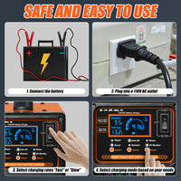 【Comprehensive Safety Protections】To keep your battery and equipment safe, this battery charger is loaded with multi-layer safeguards: reverse polarity, short circuit, overcharge, overheat, over-voltage, and over-current protection. Plus, this battery charger has spark-free connections to avoid accidental sparks during setup, and a built-in cooling fan to prevent overheating during long charging sessions—ensuring every use of this battery charger is safe and worry-free.