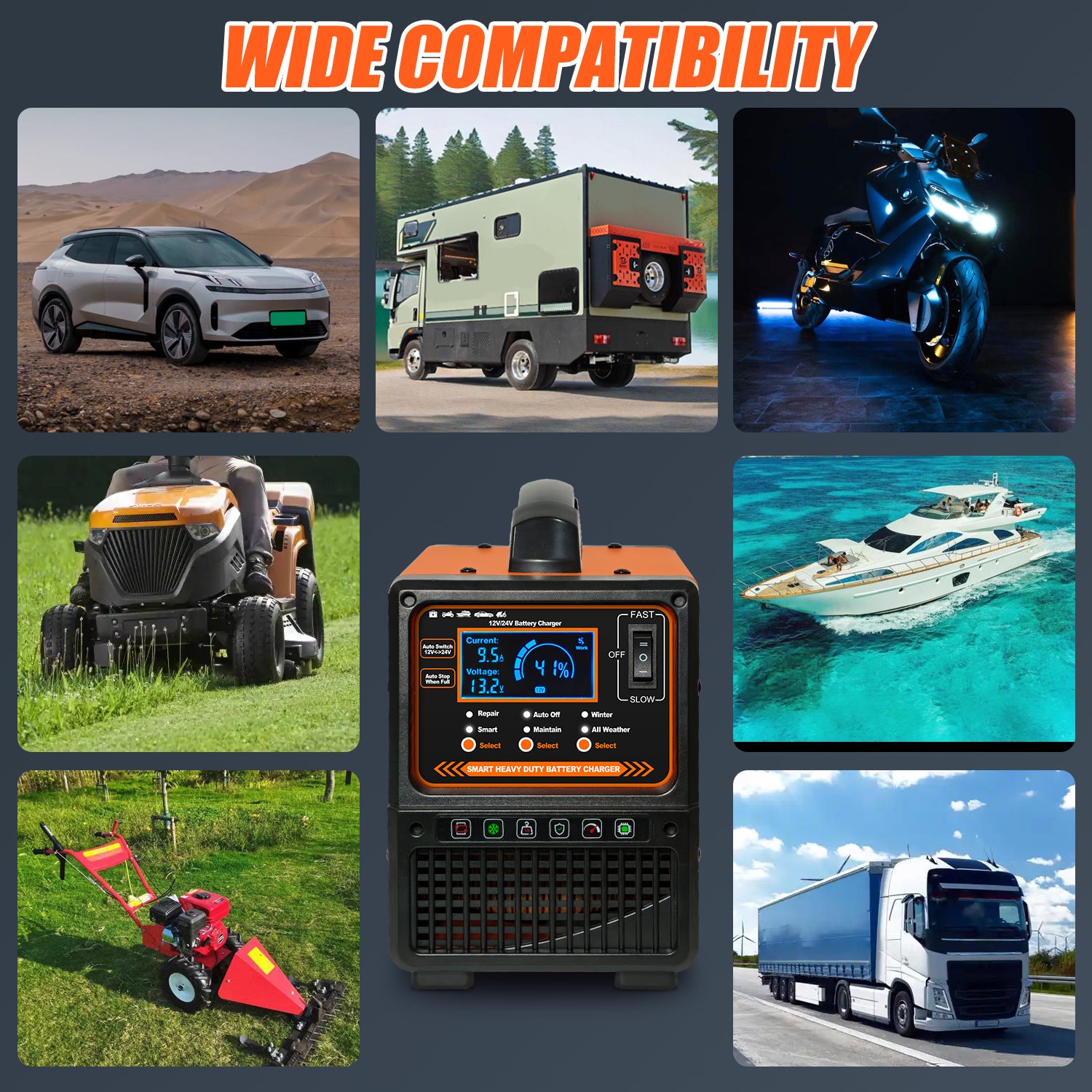 【Heavy-Duty & Wide Compatibility】Crafted with a copper coil, sturdy metal, and ABS casing, this battery charger is built to withstand regular use and last for years. It works seamlessly with all 12V/24V lead-acid batteries—including AGM, GEL, Wet/Flooded, EFB, Calcium, and deep-cycle models—making the battery charger a versatile pick for cars, trucks, motorcycles, boats, RVs, and lawn mowers. With 6ft AC and 4ft DC cables, this battery charger also offers flexible placement for easy setup.