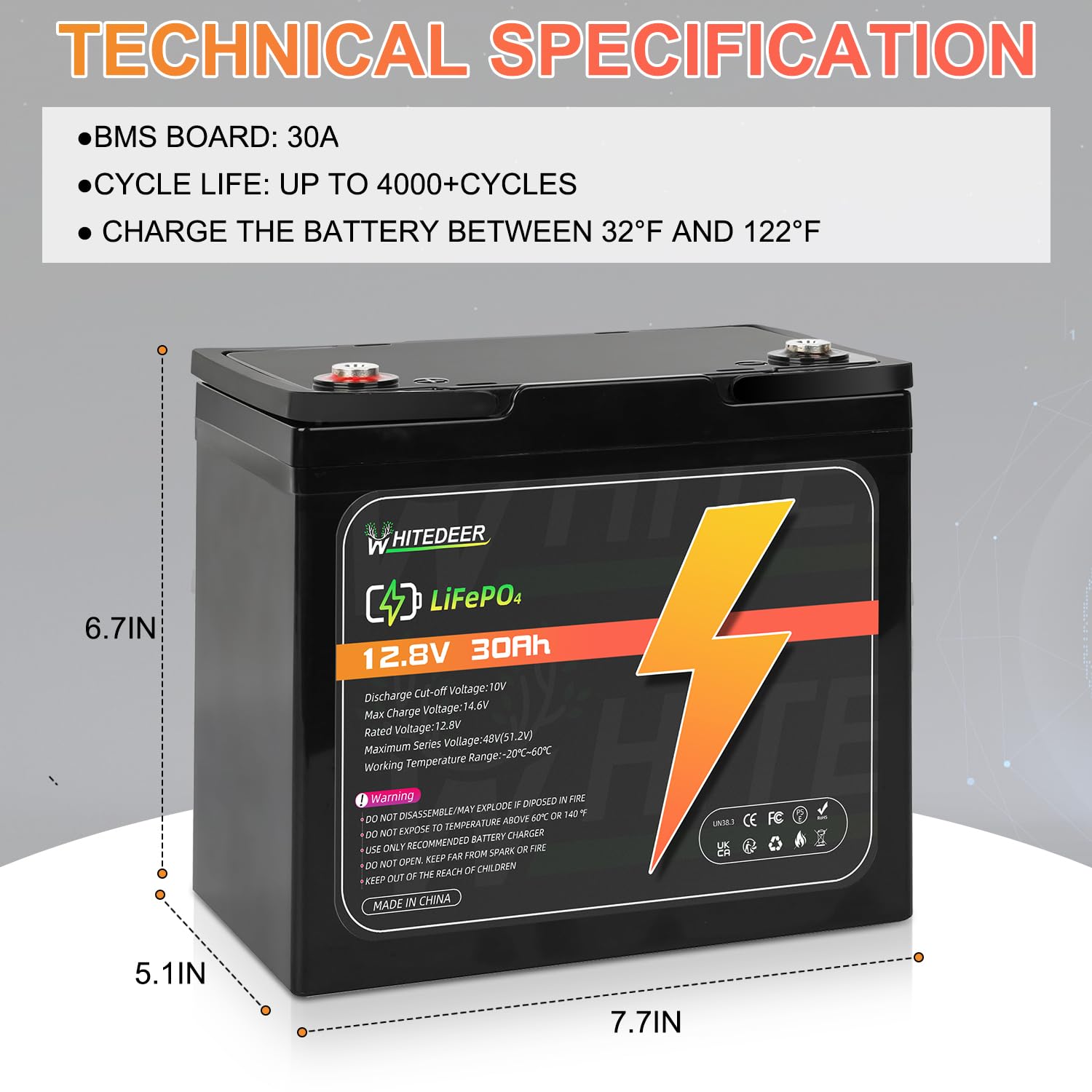 🔋【Grade-A LFP Cells】 WHITEDEEP 12.8V 30Ah Lithium Iron Phosphate (LiFePO4) Battery is made of automotive grade LiFePO4 Cells, which has higher energy density, more stable performance & & greater power. Compared with the 300-500 cycles and 3-year lifespan of lead-acid battery, WHITEDEEP battery has more than 4000 deep cycles and a 10-year lifespan.