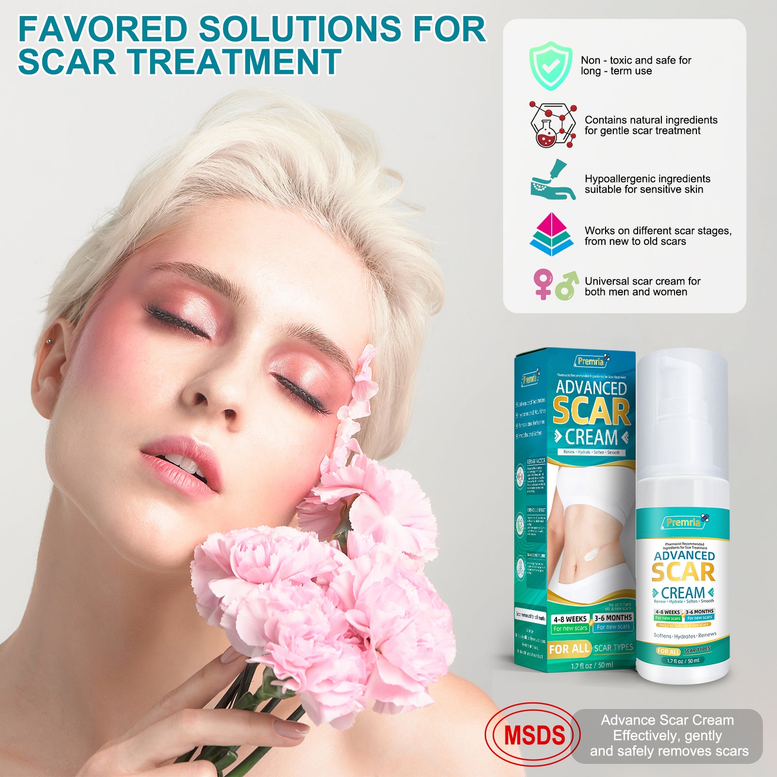 - RENEW YOUR SKIN: Our advanced scar cream for scars restore your skin soft and smooth. Premria scar removal cream is appliable for many types of scars including C-Section, surgery, injury, burns, acne, stretch marks, keloids, hypertrophic, insect bites, cuts and scrapes. This scar cream gel is suitable for all skin types, for both men and women.